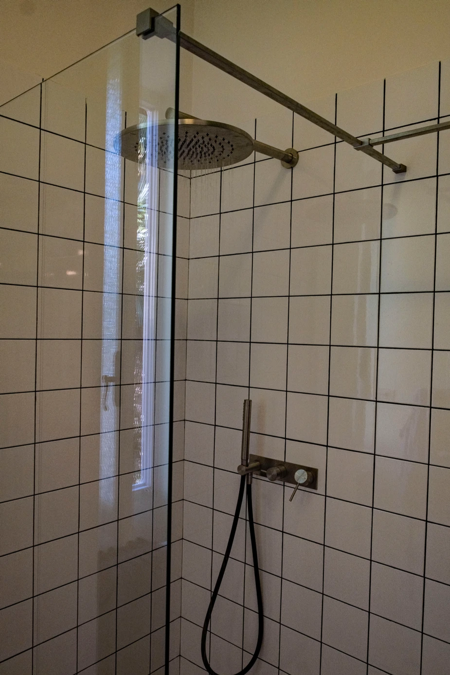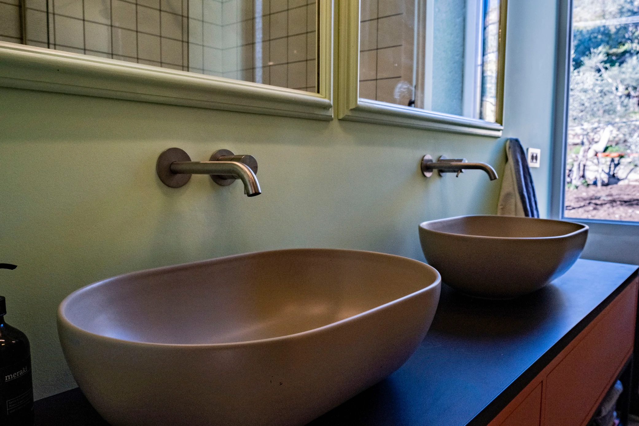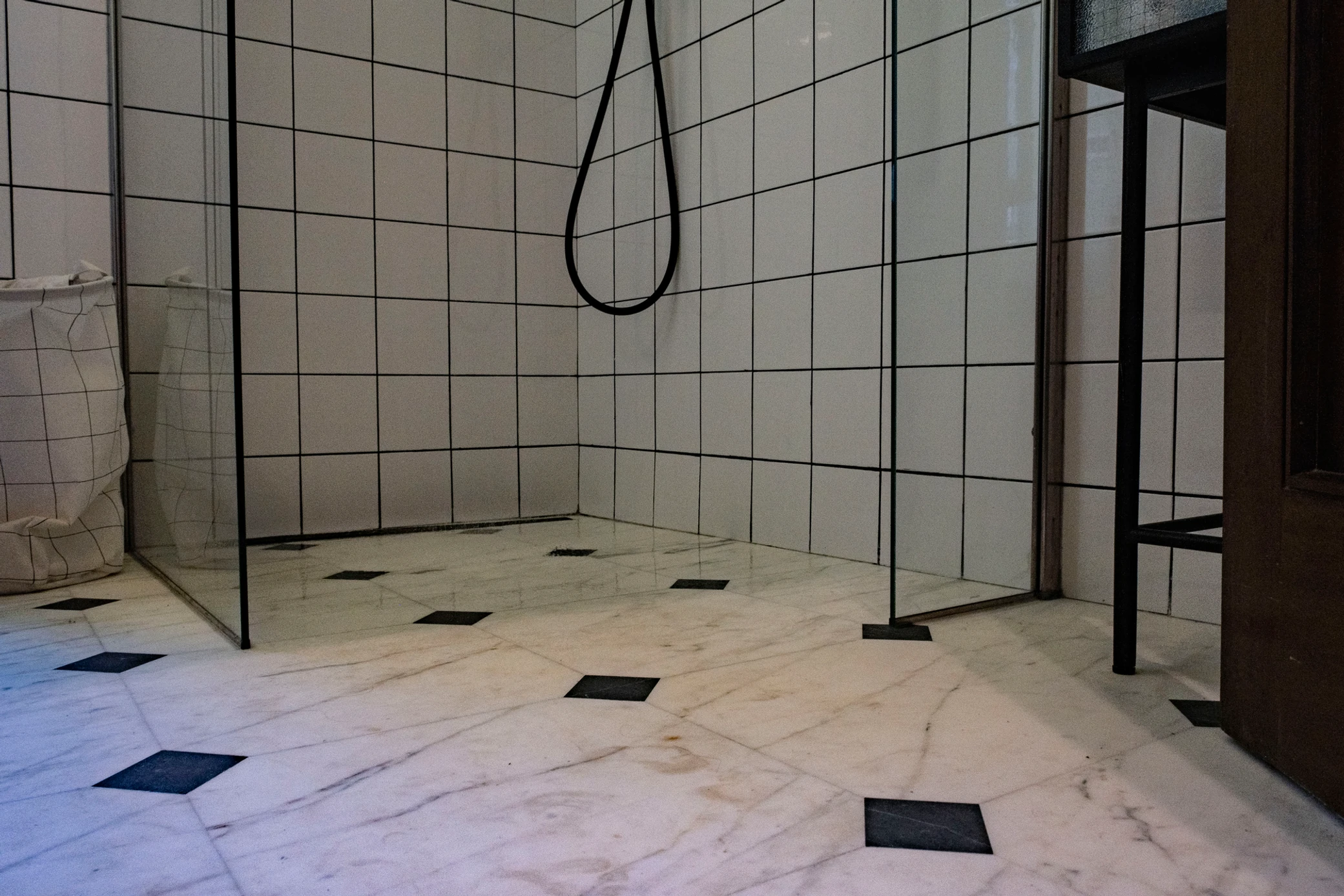 Rimasti inalterati nelle dimensioni ma rinnovati completamente negli impianti e accessori. Realizzando i pavimenti in marmo e ardesia, per riprendere il pavimento originale del corridoio. Per i rivestimenti si è utilizzato il formato quadrato 15x15 delle classicissime piastrelle bianche, sulle pareti dei lavabo uno smalto opaco traspirante.