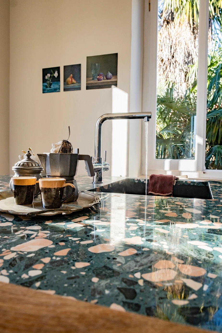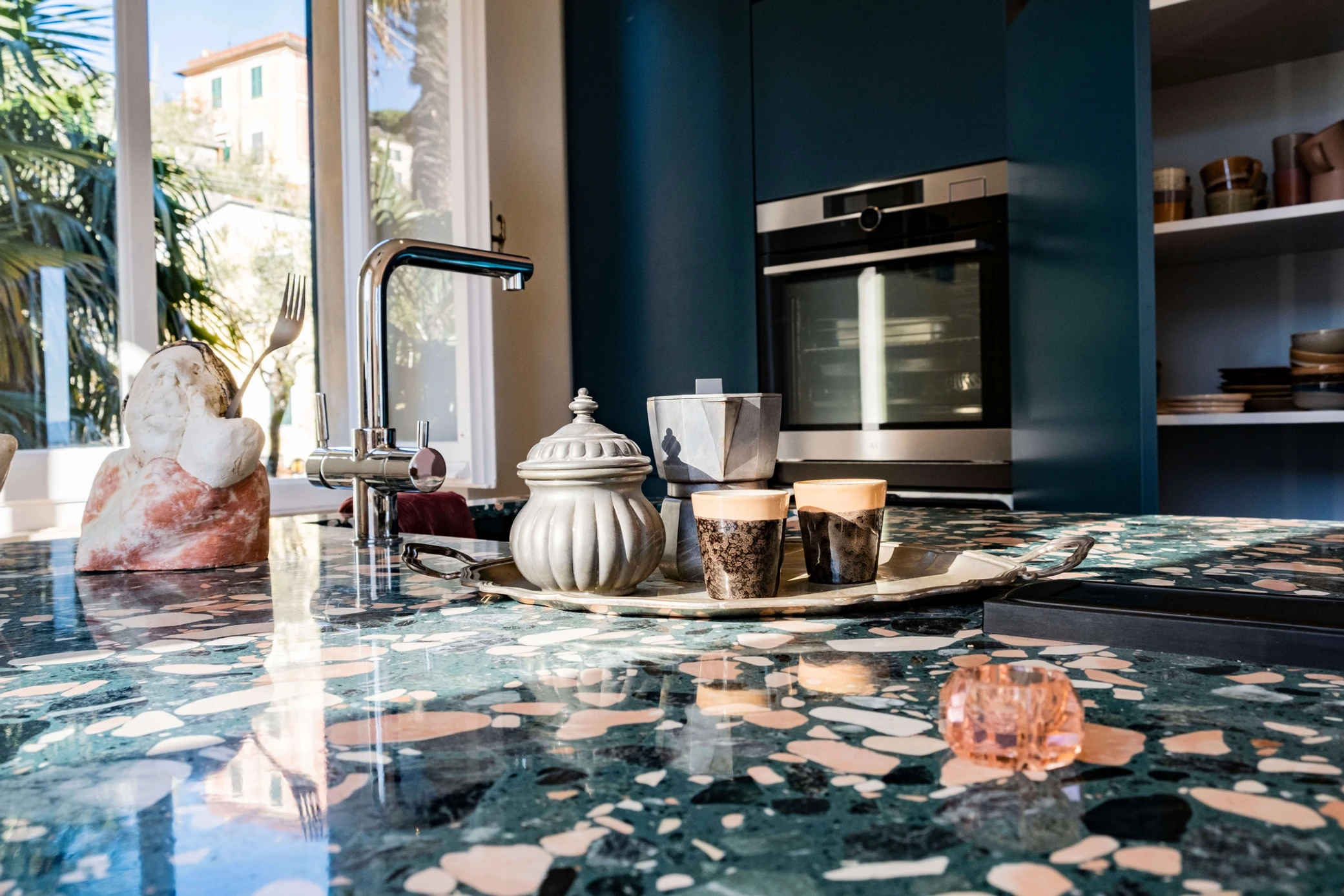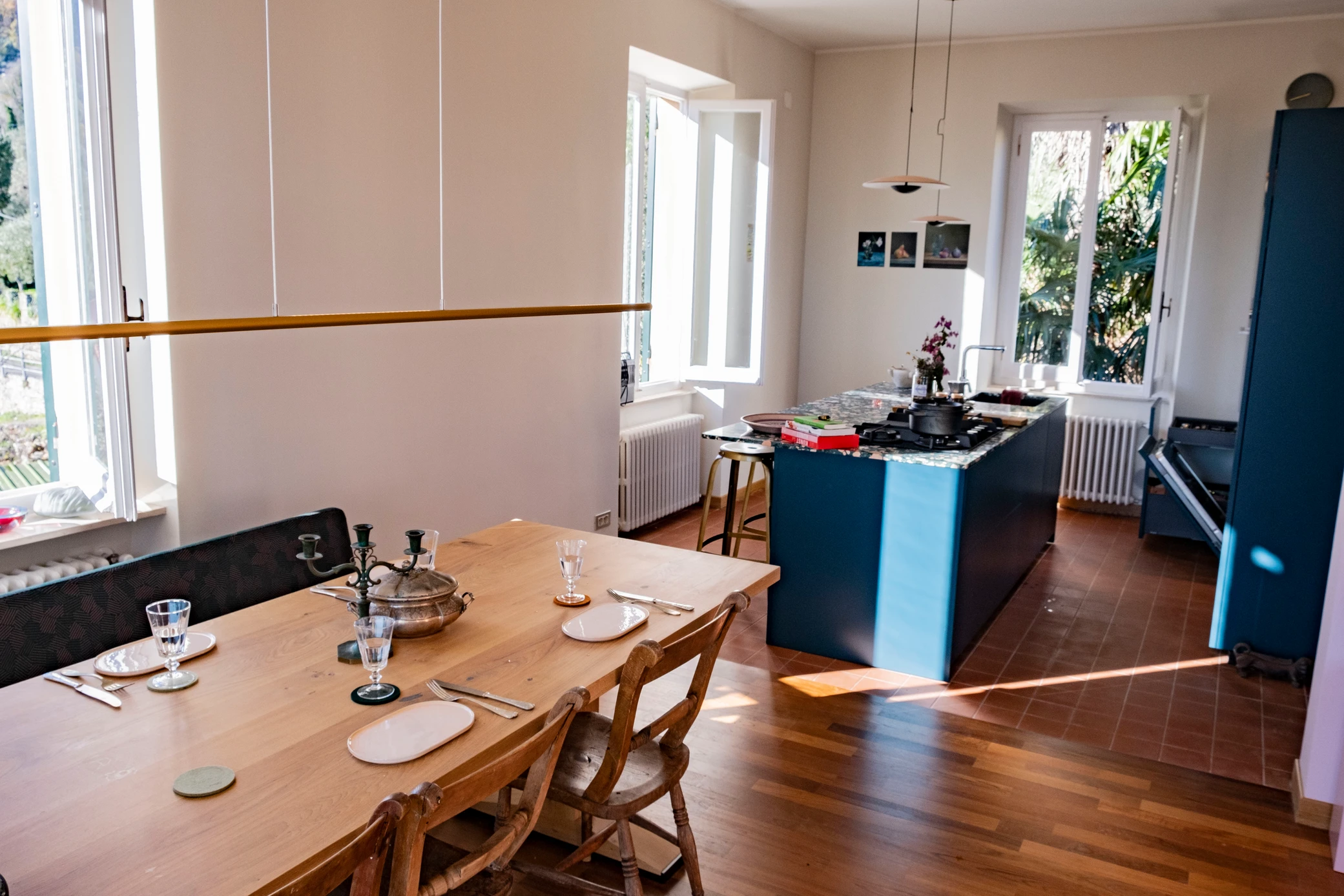 ...si sà rappresenta il cuore, l'ambiente dove si prepara e trasforma il cibo, per nutrirsi e nutrire chi amiamo. I proprietari desideravano un fulcro dove preparare e lavare, avere un grande spazio contenitivo, e mantenere libere le finestre sul giardino e sul panorama. L'isola centrale, con il lavello, fuochi a cappa integrata e la parete attrezzata lungo il muro, hanno soddisfatto i loro desideri.